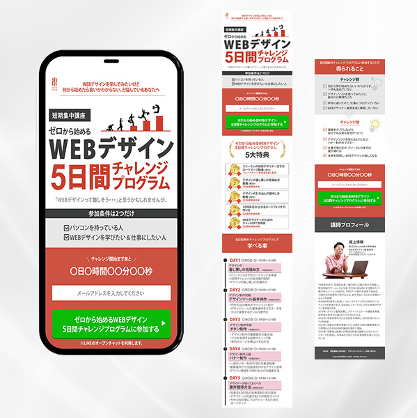 「5日間で少しずつステップアップしていく」イメージを、人が段階的に成長していくシルエットイラストで表現しました。受講者が“自分も一歩ずつ前進できそう”と感じられるよう、挑戦と成長をテーマにした構成です。配色は「ぬるま湯デザイン塾」の公式サイトカラーを基調に、全体に統一感とブランドの親和性を持たせています。文字は「WEBデザイン」を黒で、「5日間チャレンジプログラム」を赤で配置し、強調の順序と視線誘導の流れを明確にしました。余白や段組みにもこだわり、スマホで見たときの読みやすさとテンポよく情報が伝わるリズム感を重視。学びのスタートラインに立つ人へ、“やってみたい”という気持ちを後押しするデザインを目指しました。