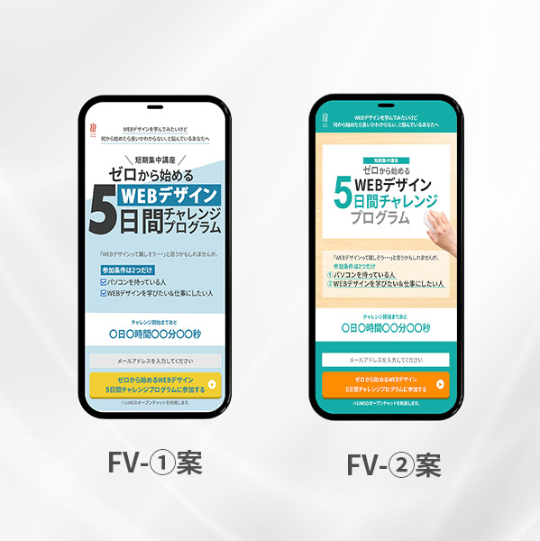 ターゲットは40代前後の男女(女性7割・男性3割)を想定しナチュラルで爽やかな印象に仕上げました。女性がデスクで作業しているイメージを使用し、「自分にもできそう」と感じられる親しみやすさを演出しています。配色は青緑を基調に安心感・信頼感を表現し、男女どちらにも受け入れられるバランスを意識しました。文字配色では「WEBデザイン」を黒で、「5日間チャレンジ」を青緑で強調し、視線の流れと訴求ポイントが明確に伝わる構成としています。無料チャレンジ参加へのハードルを下げ、スマホからでも安心して申し込みに進めるよう、信頼性と分かりやすさを重視しています。